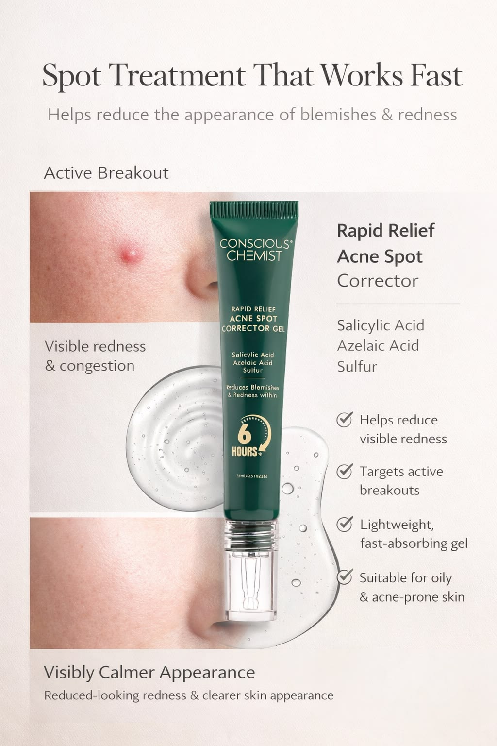 The Rapid Relief Acne Spot Corrector is a lightweight, non-greasy gel formulated to penetrate deep into the pores. Unlike all-over treatments, this is a high-potency spot treatment meant to be applied directly onto the “problem area” to accelerate healing.