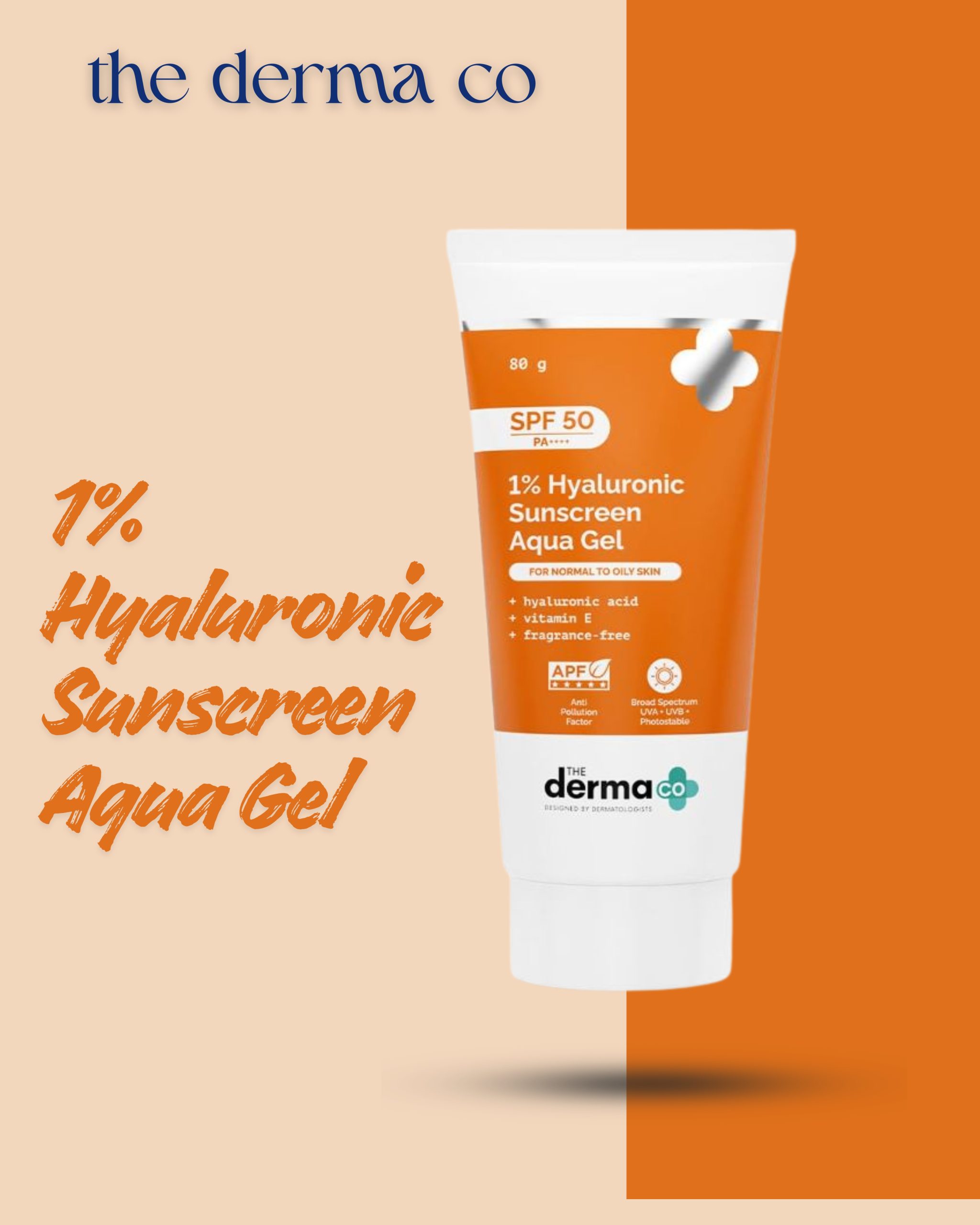 The Derma Co 1% Hyaluronic Sunscreen Aqua Gel is a lightweight, non-greasy sunscreen formulated with a powerful blend of Hyaluronic Acid and Vitamin E. It provides broad-spectrum protection with SPF 50 and PA++++, meaning it shields your skin from both UVA rays (which cause aging) and UVB rays (which cause burning).